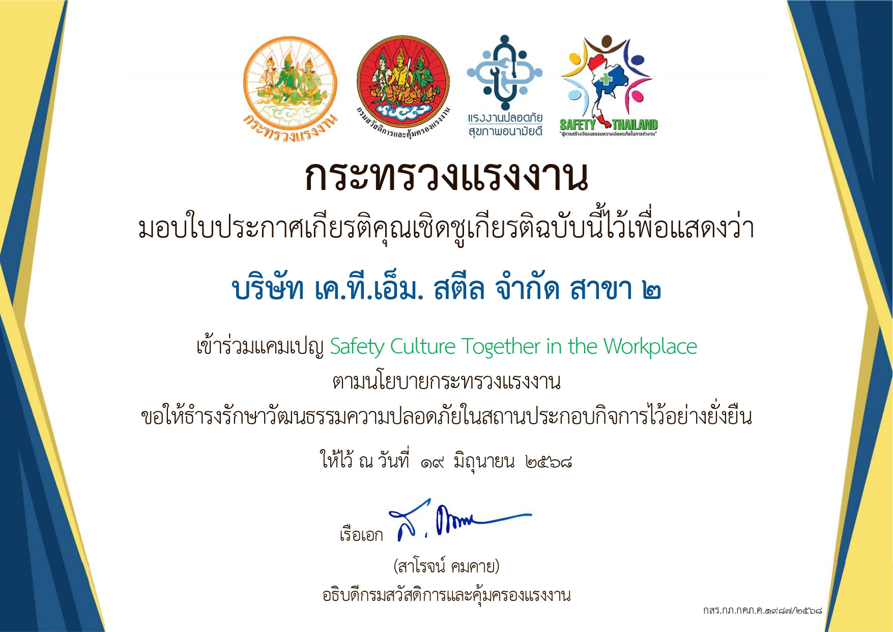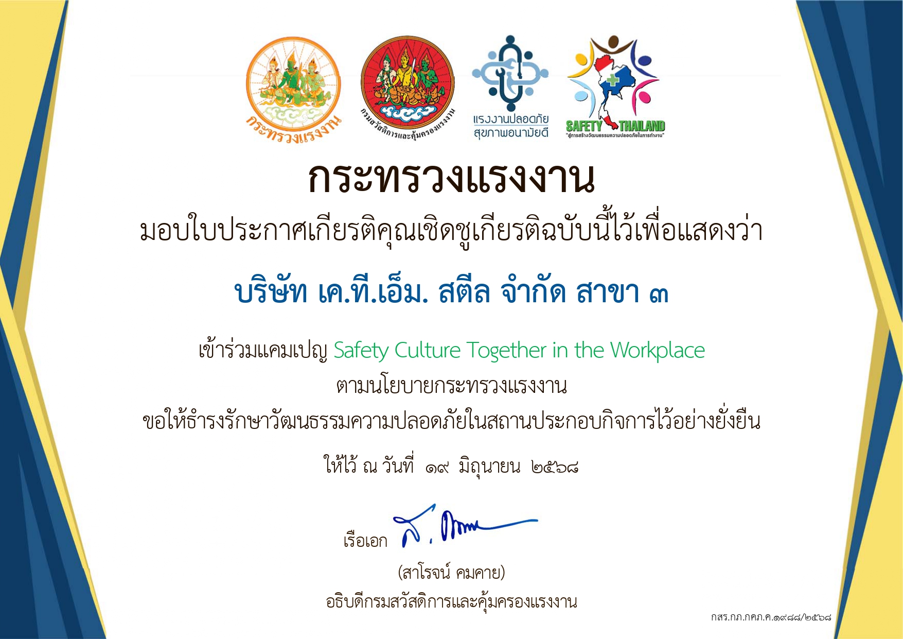 กระทรวงแรงงาน เข้าร่วม แคมเปญ Safety Culture Together in the Workplace